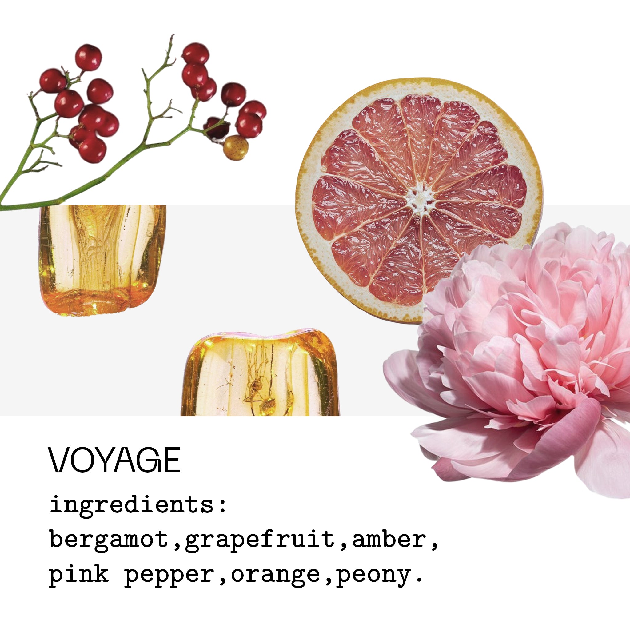 Notes: bergamot, grapefruit, pink pepper, orange, peony, musk, amber.